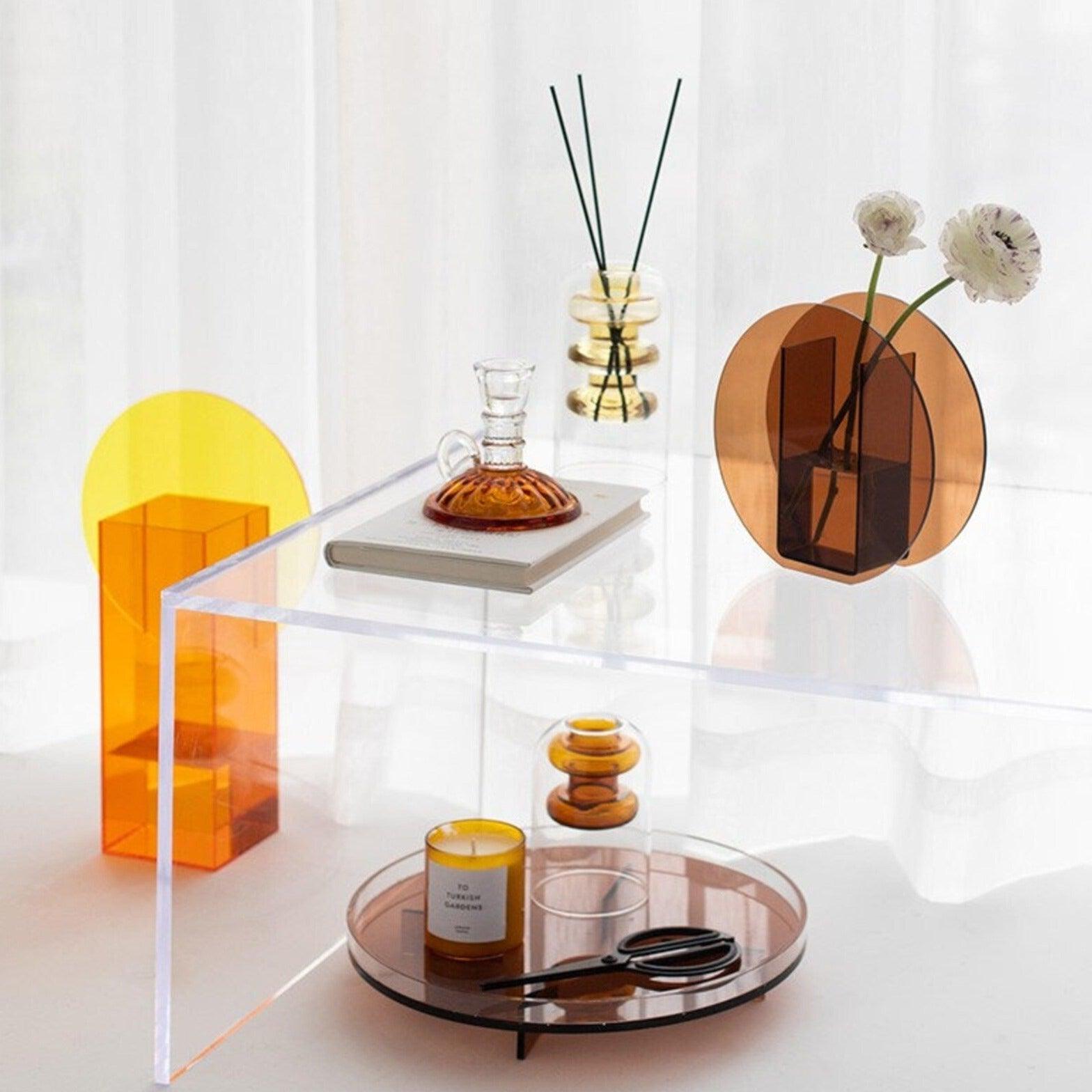 A modern translucent acrylic vase inspired by warm sunrise-to-sunset tones, bringing a soft retro glow and artistic charm to any space. Perfect as a sculptural décor piece or for displaying blooms, it adds a pop of color and minimalist elegance to desks, shelves, tables, and entryways.