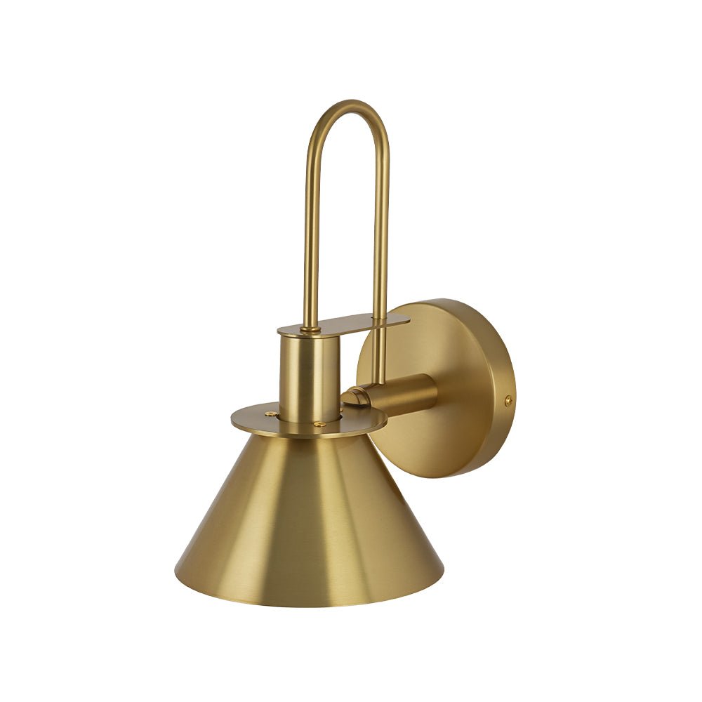A sleek cone-shaped wall light that blends soft modern elegance with retro charm. Its curved brass arm and smooth matte shade create a warm, focused glow perfect for adding stylish accent lighting to hallways, bedrooms, living areas, or cozy reading corners.