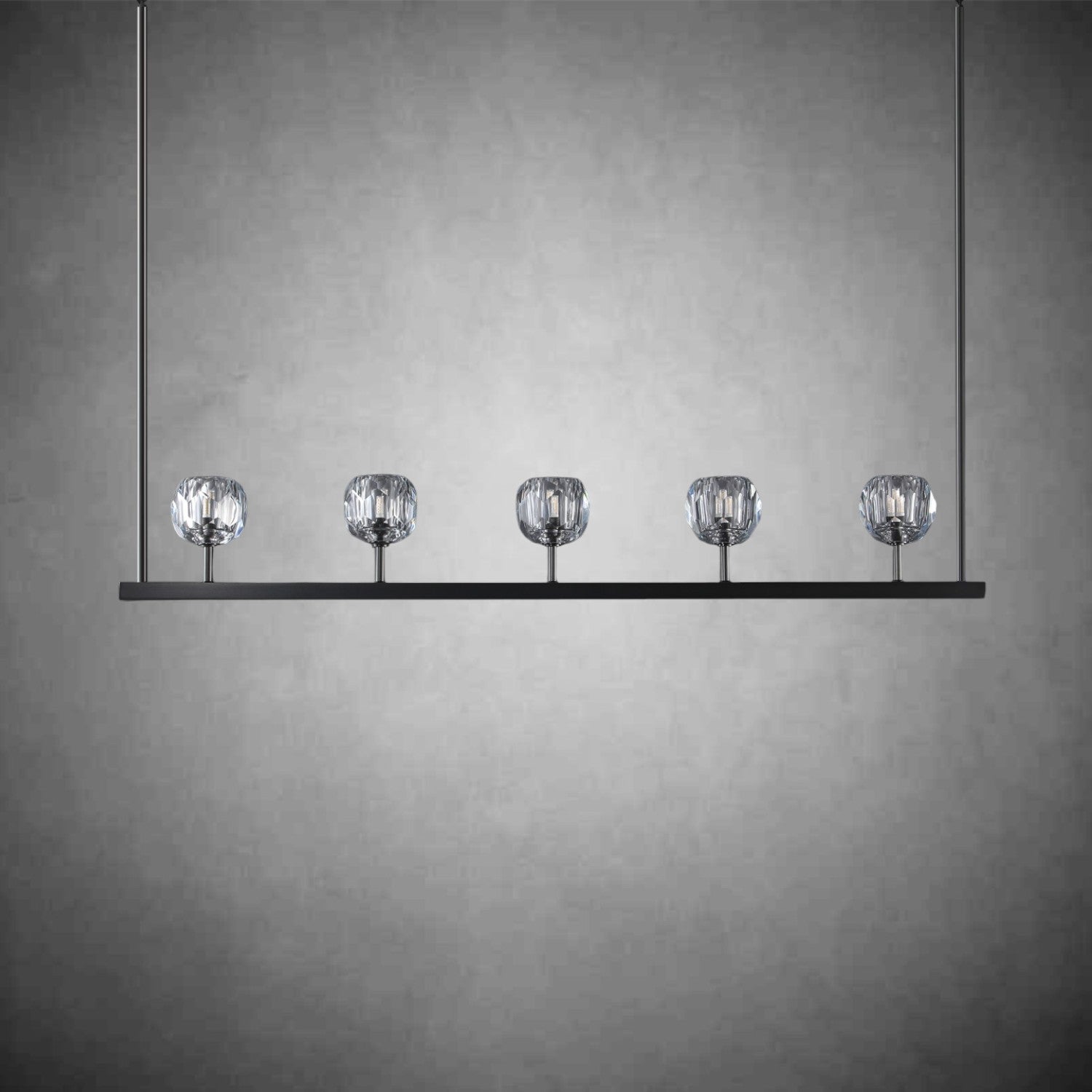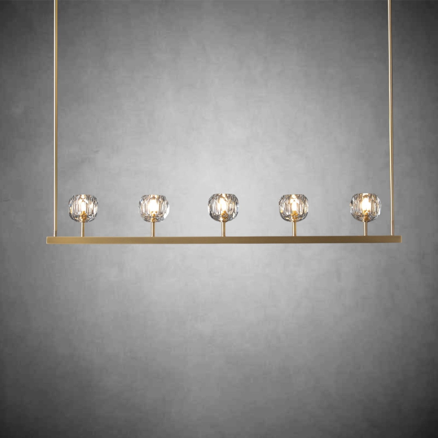 The Crystal Ball Linear Chandelier blends precision craftsmanship with modern luxury. Each hand-cut K9 crystal sphere rests on a sleek brass frame, creating a radiant display of light and elegance. Its refined symmetry and warm illumination make it a stunning centerpiece for dining rooms, kitchens, or modern living spacesperfectly balancing artistry and sophistication.