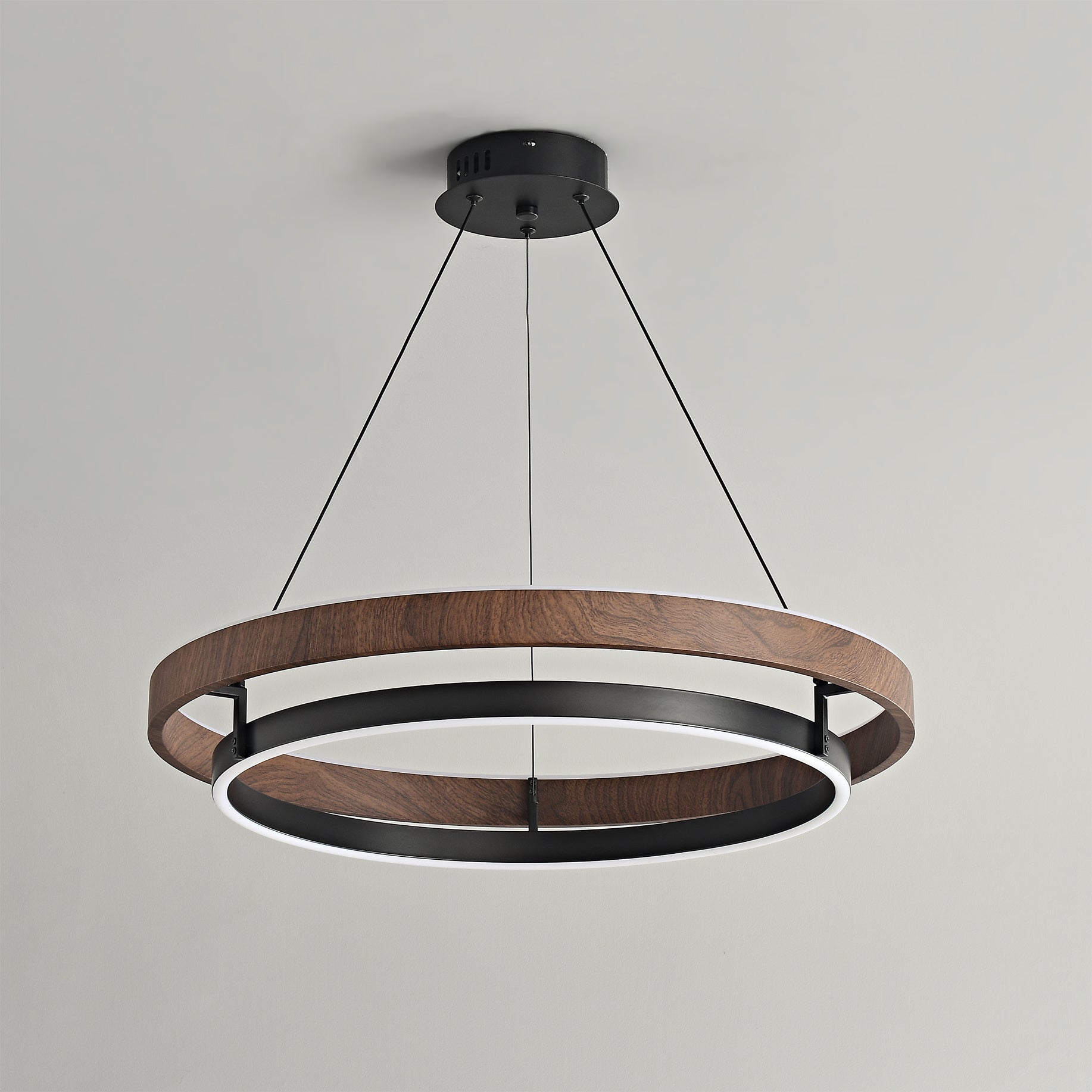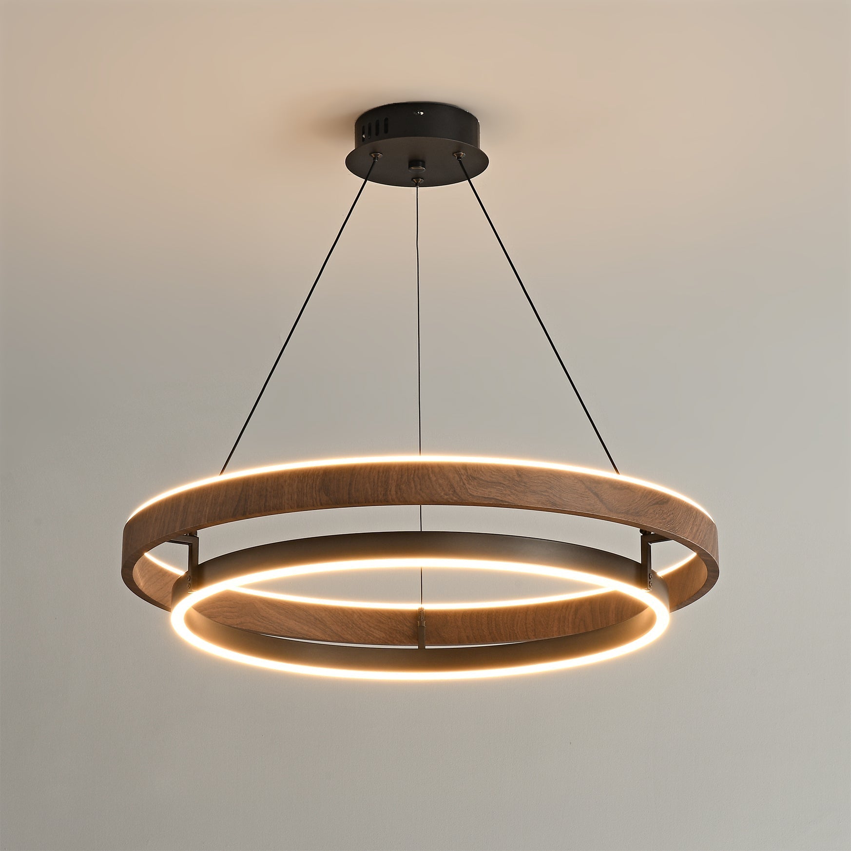 The Double Ring LED Chandelier combines sleek design with natural warmth, featuring a walnut wood-effect finish and integrated LED lighting. Its floating dual-ring structure creates a soft, ambient glow, adding sophistication to dining rooms, living spaces, or loft interiors. Perfect for those seeking minimalist elegance with a contemporary edge.