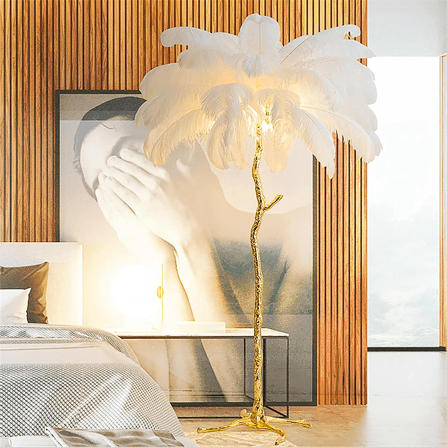 A stunning sculptural floor lamp featuring soft ostrich feathers and a gold-tone tree-inspired base, adding dreamy elegance and statement luxury to any room. Hand-crafted with delicate feather detail and warm ambient lighting, it creates an opulent centerpiece perfect for bedrooms, lounges, or boutique-style interiors.