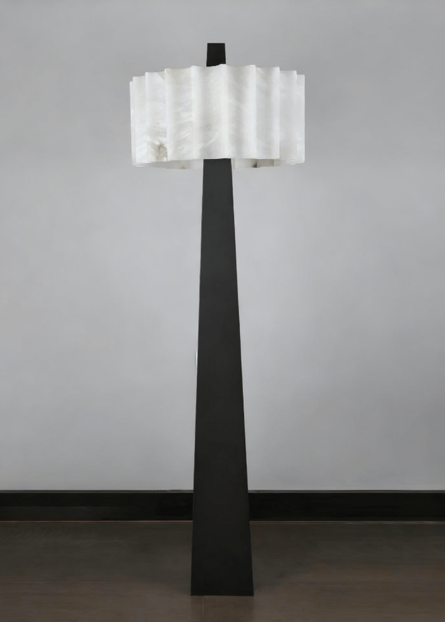 The Pleat Tower Floor Lamp showcases a bold architectural design that blends art and illumination. Its sleek black tapered base supports a beautifully pleated alabaster shade, casting a soft, ambient glow that transforms any space. Perfect for modern interiors, it adds sculptural elegance and serene warmth to living rooms, lounges, or creative studios.