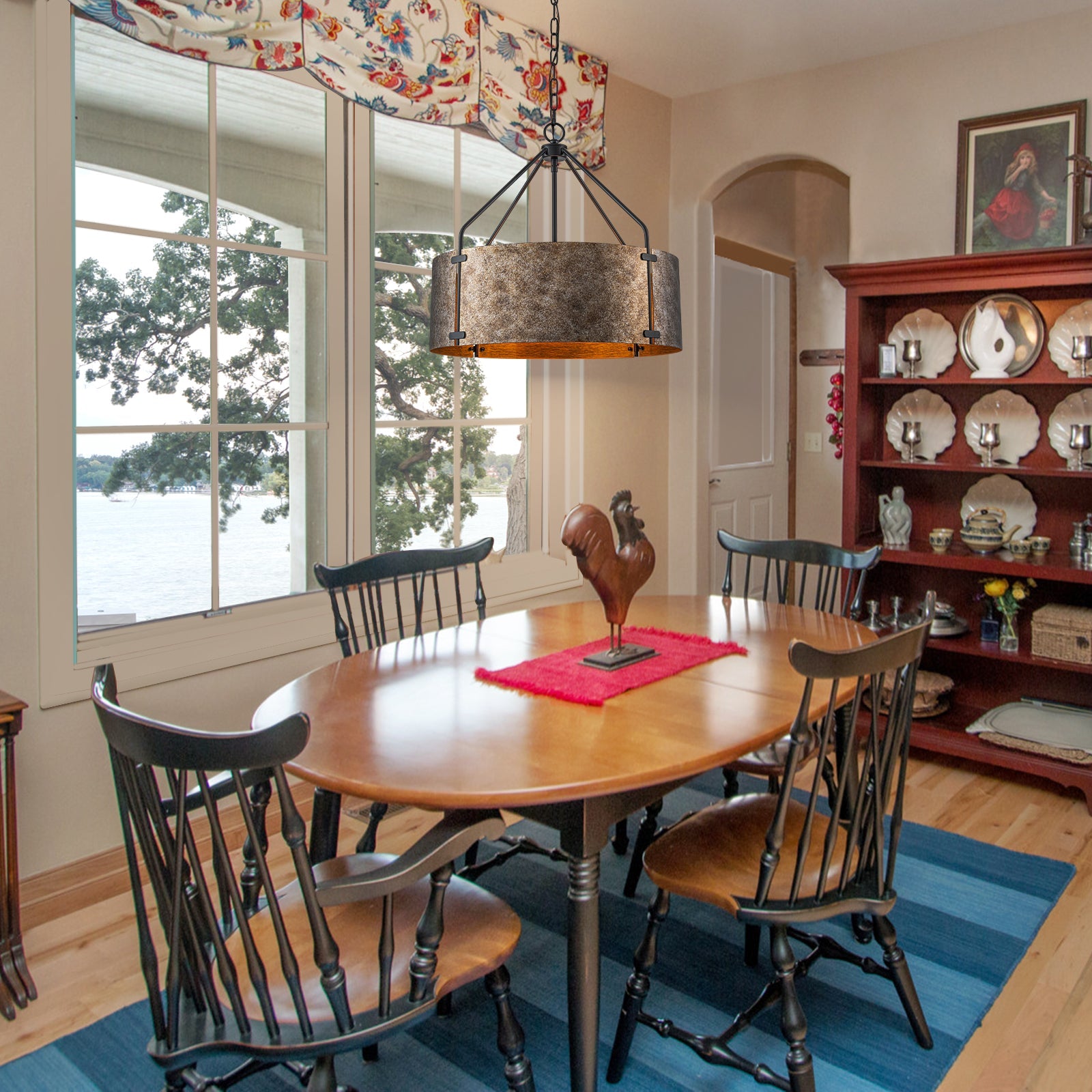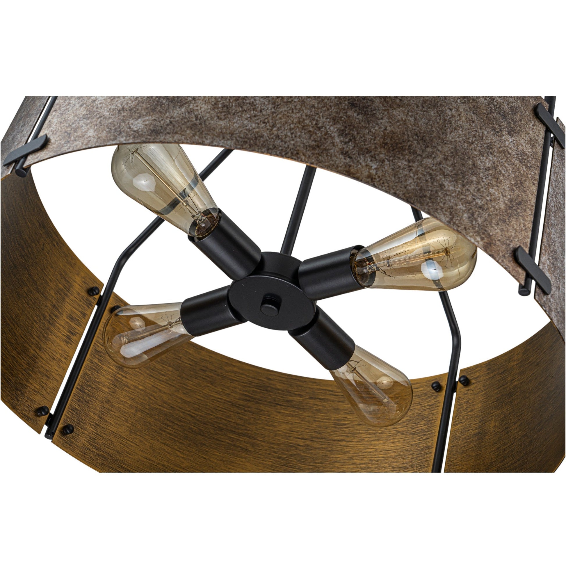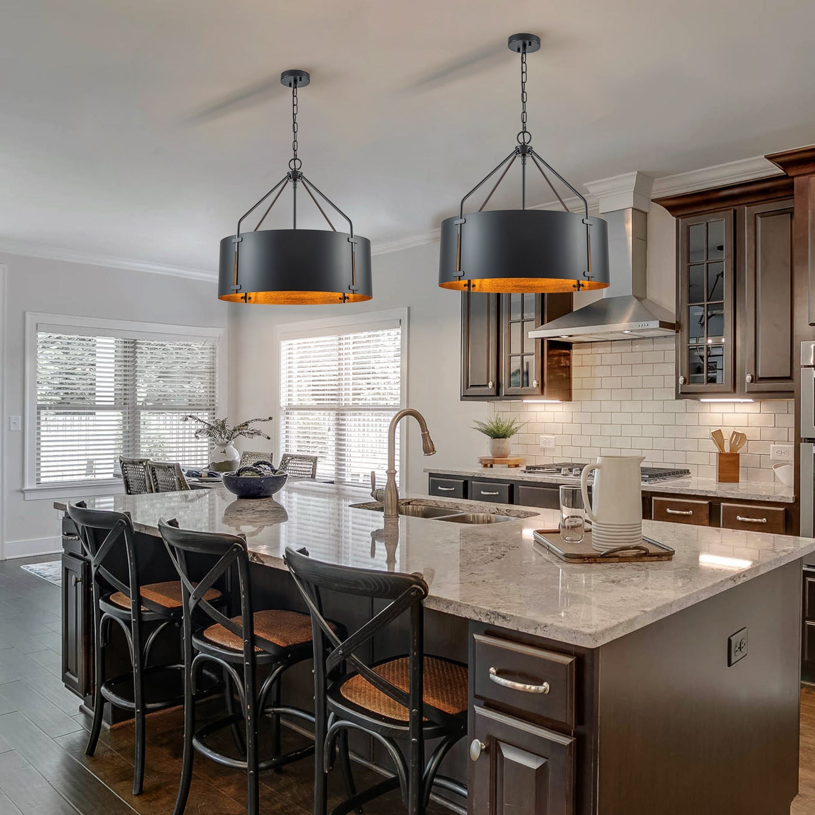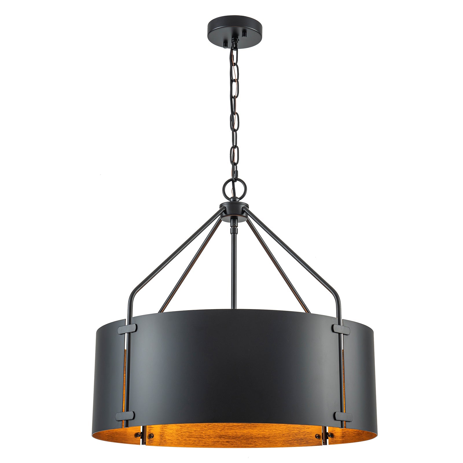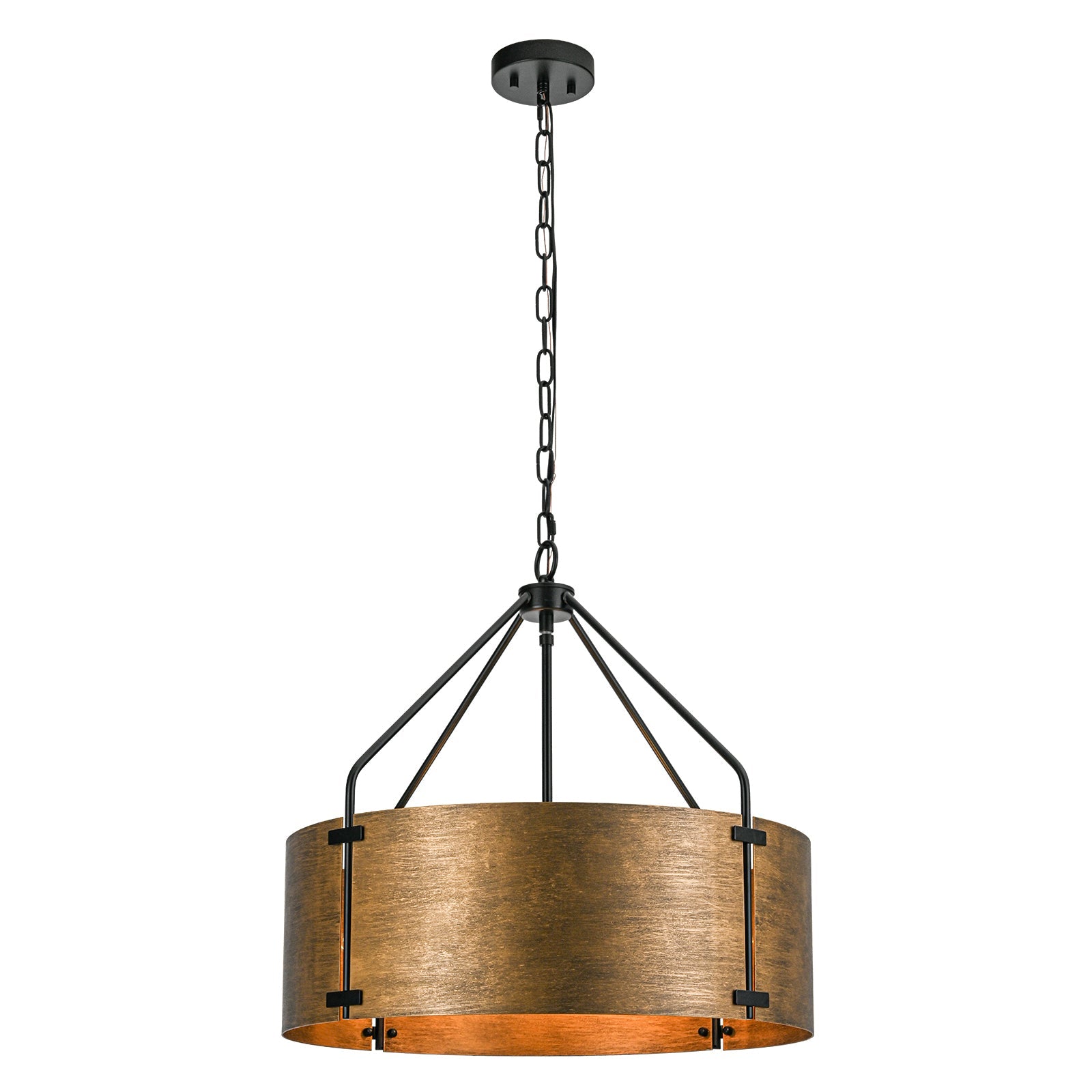 Bold yet refined, the Ruston Drum Pendant Light blends rugged industrial character with warm vintage charm. Its curved bronze metal panels and matte black frame create a striking silhouette, while the open drum design allows light to flow freely—casting a soft, inviting glow. Perfect for adding depth and texture to modern farmhouse or loft-inspired interiors.