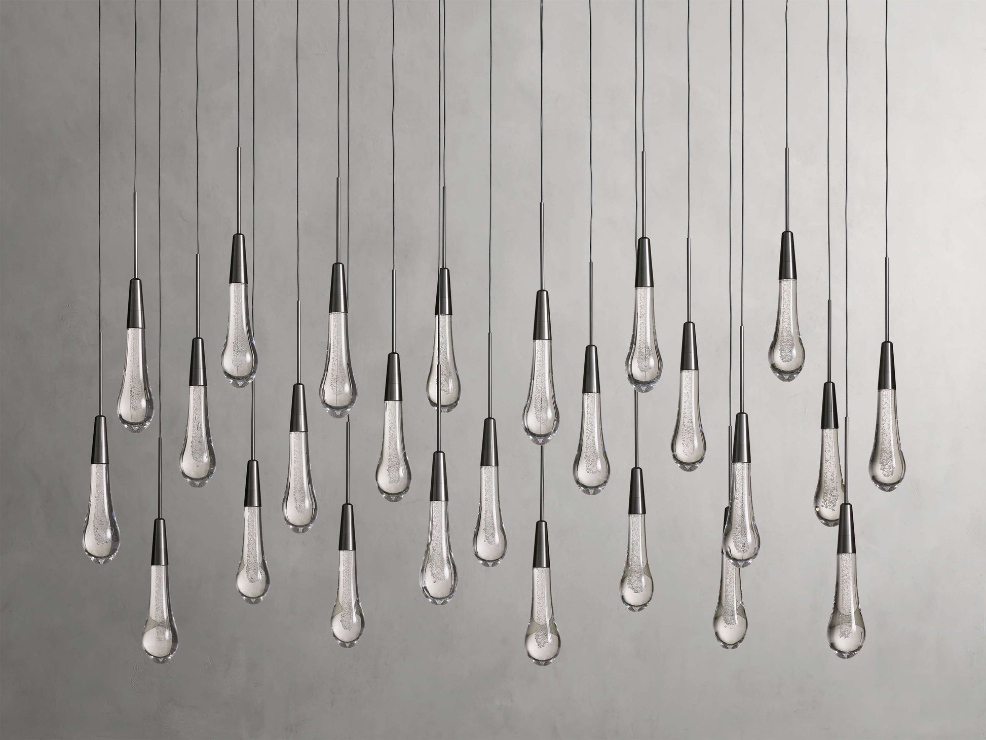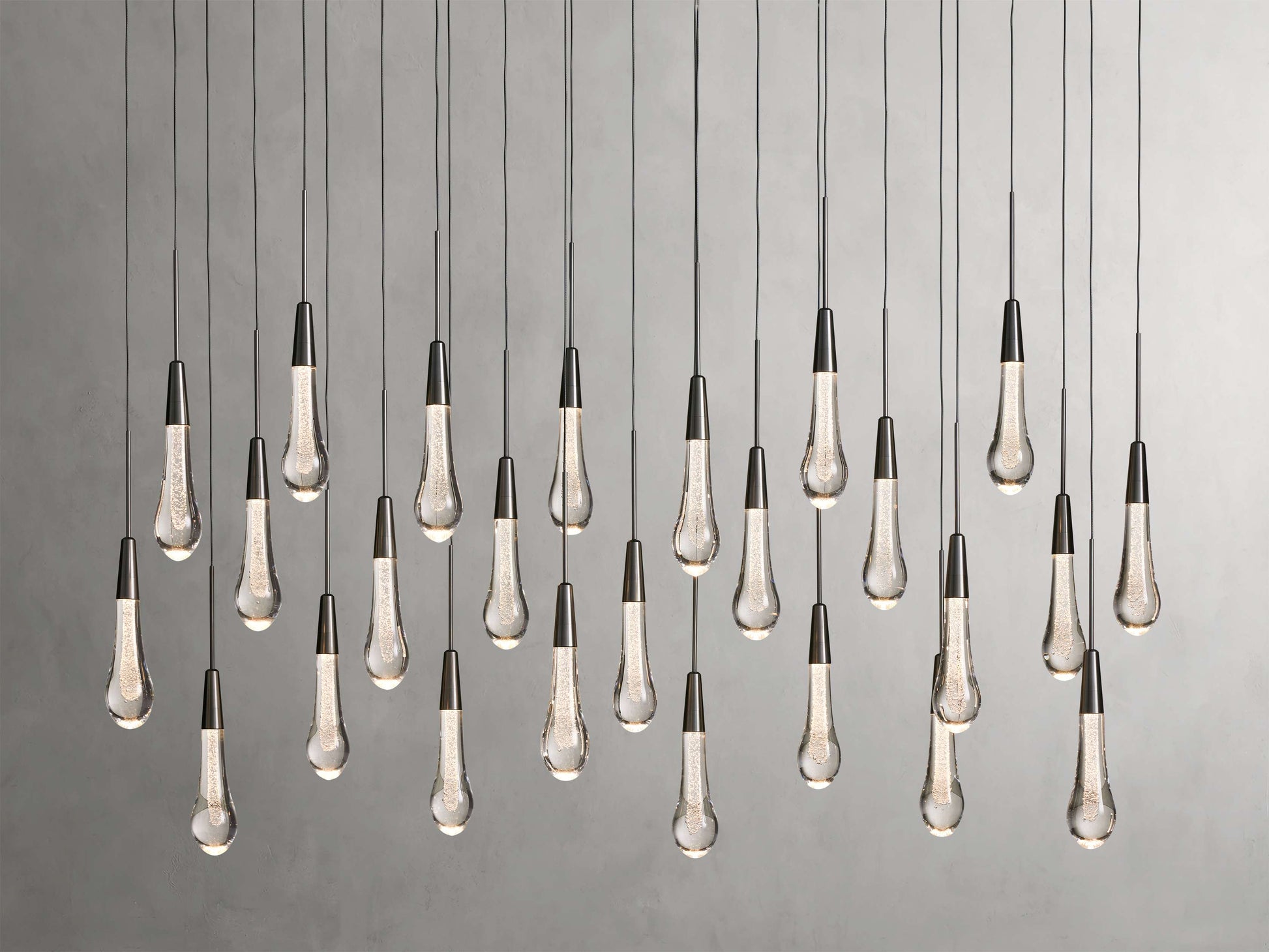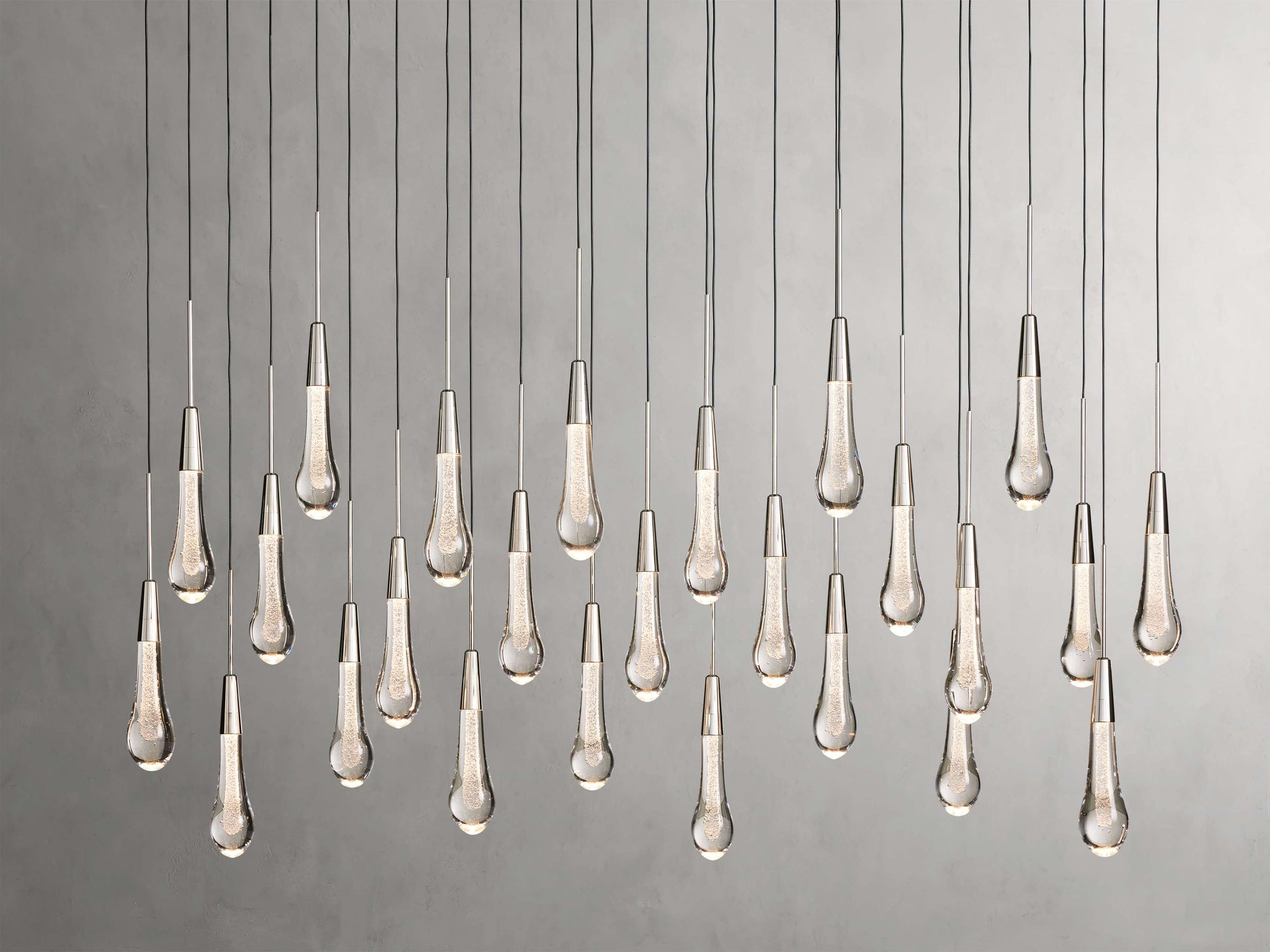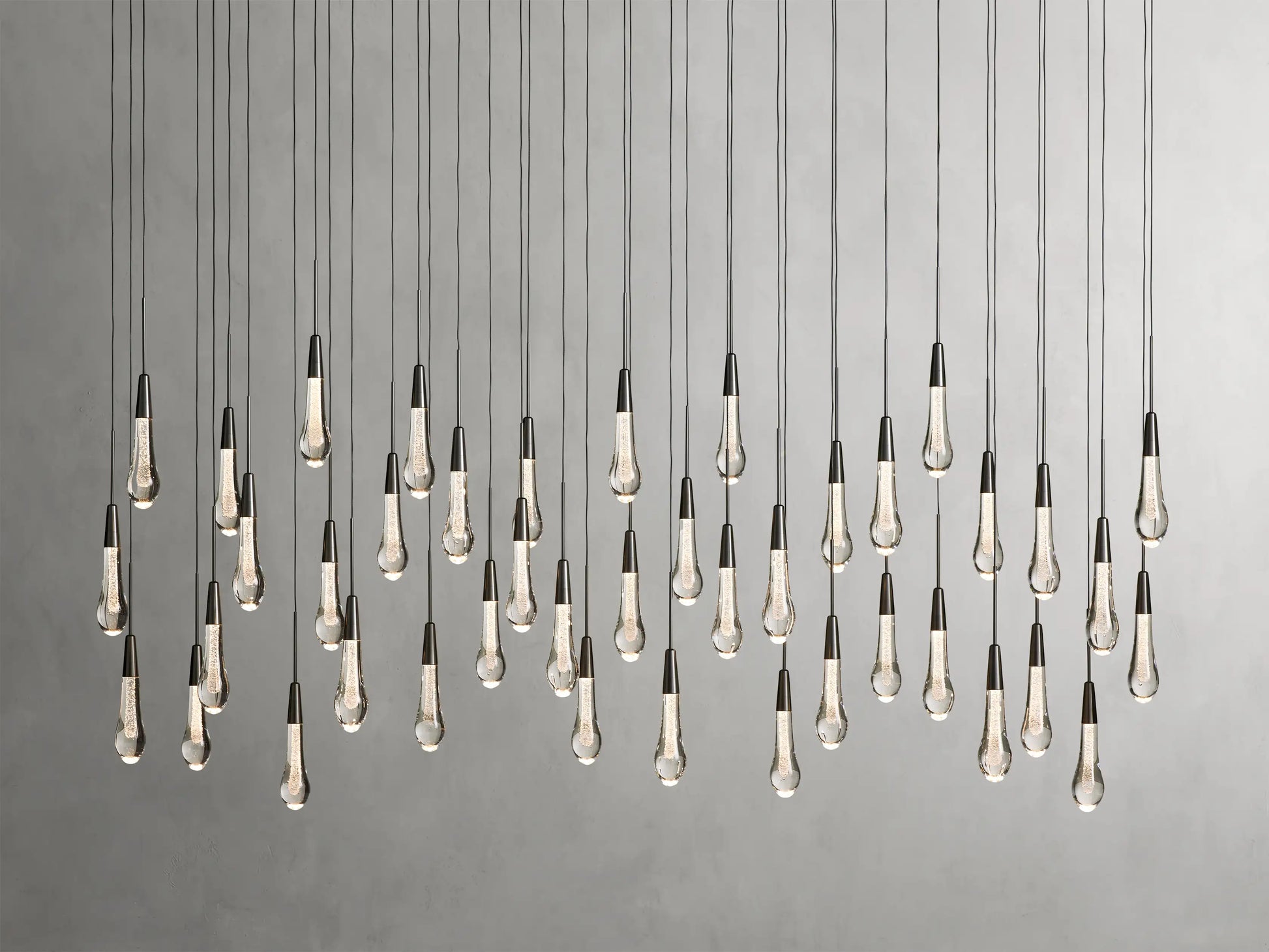 The Soltaire Raindrop LED Chandelier captures the elegance of nature with its cascading design of handcrafted seeded glass droplets. Suspended from adjustable black PVC cords, each drop glows with warm, integrated LED light, creating a stunning visual reminiscent of falling rain. Perfect for kitchens, dining areas, or staircases, this chandelier combines artistic beauty with modern functionality and energy efficiency.