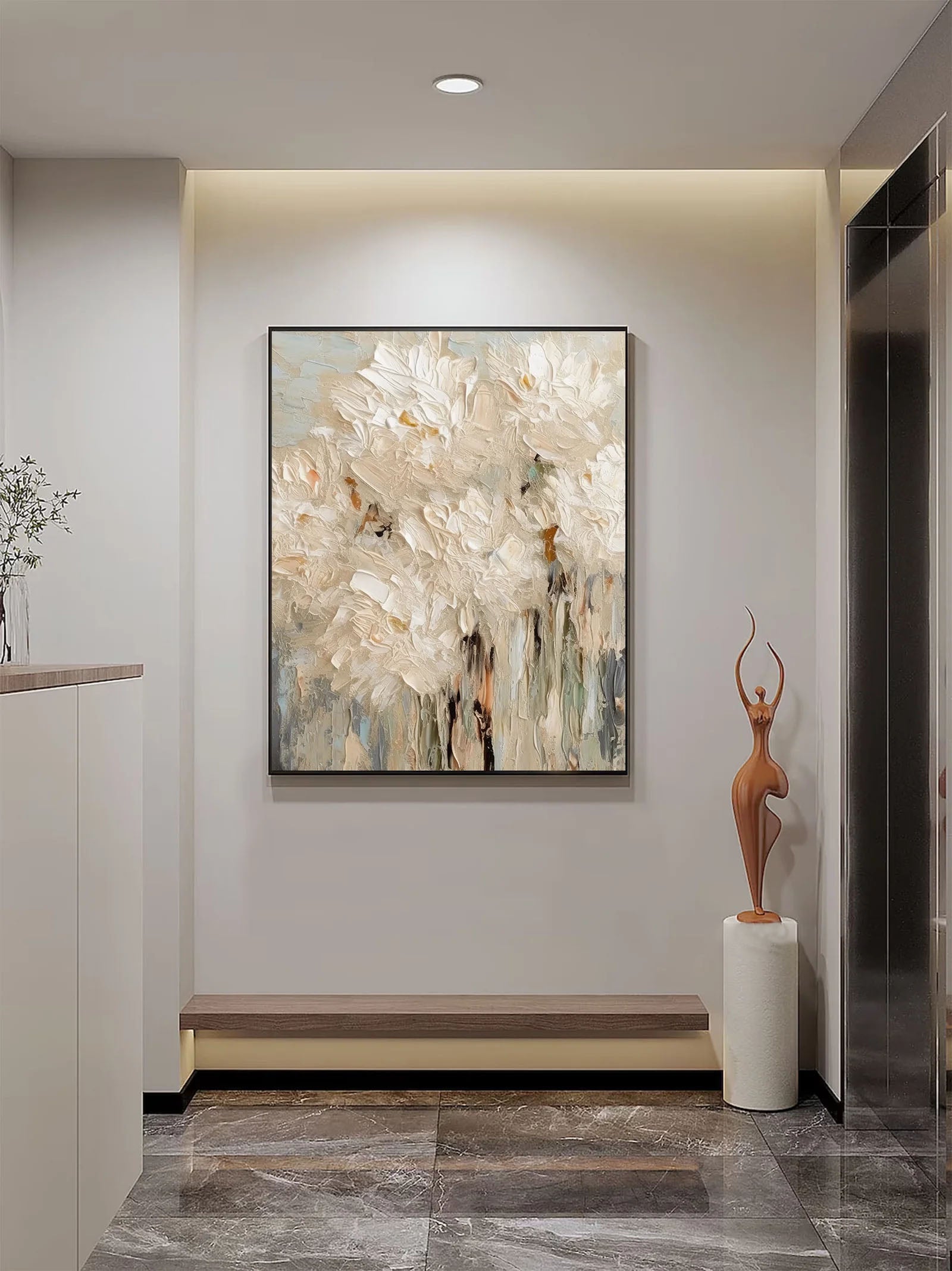 A beautifully crafted textured canvas painting featuring soft floral forms with rich 3D detailing, perfect for adding an elegant touch to any room. Hand-painted on high-quality linen, available rolled or framed, made-to-order with careful packing, free fast shipping, and custom size options.