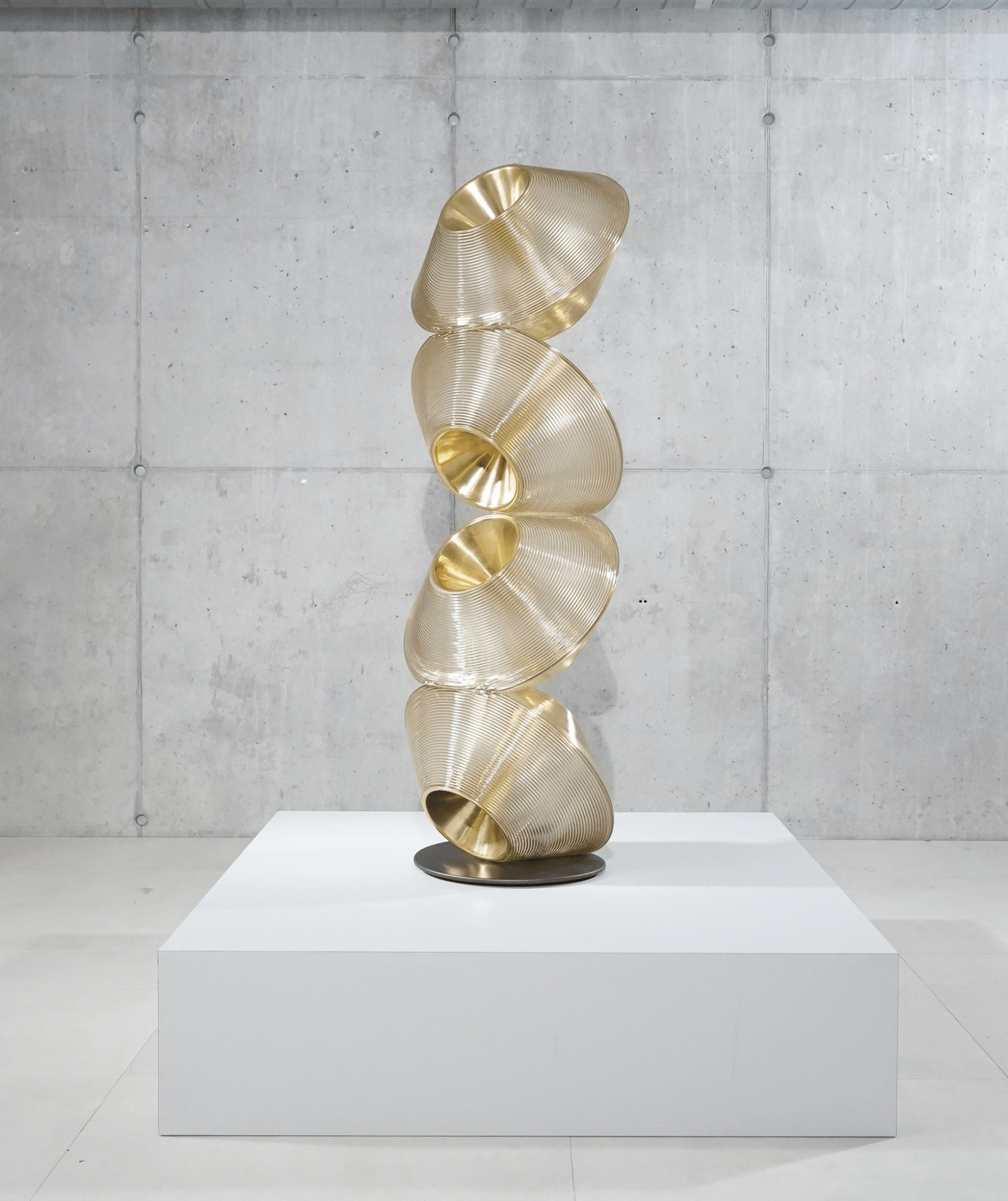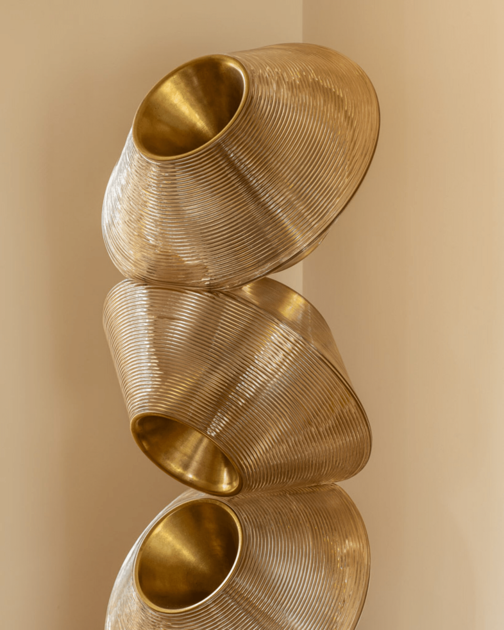 The Vortex Flow Floor Lamp captivates with its sculptural, fluid design — four golden shades stacked in a dynamic spiral that radiates soft, ambient light. Crafted from metal and resin, its luminous golden finish and artistic form make it a striking statement piece that adds movement, warmth, and sophistication to any modern interior.